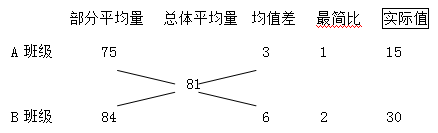 本题中,部平均量为平均分,平均分=总分/人数,所以得到的最简比就是人数之比为1:2.如果已知A班级人数为15人,则可以得到B班级人数为30人。在做题过程中,可以在上述图例中再添加一列叫实际值。