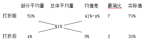 【中公解析】最终的利润率50%×82%=41%是由两部分混合得到的,一部分是70%商品的利润率,一部分是剩下30%商品的利润率,所以设打折后商品的利润率为x%。则有