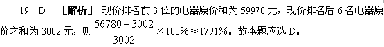 18. C [解析]长虹LT4219B涨跌率约为34.8%,荣事达BCD-110涨跌率约为40.4%,惠普笔记本2226涨跌率约为8.75%,老板907XT涨跌率约为42.5%。故本题应选C。