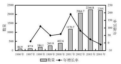 3.根据上图,1996年至2004年,城市最低生活保障人数年增长率最高的年份是哪一年?()