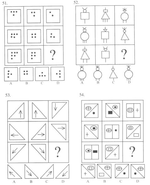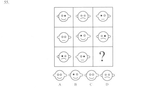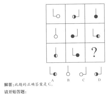 本部分包括四种类型的试题: 一、图形推理。共10题。包括两种类型的题目: (一)请从所给的四个选择项中,选择最适合的一个填在问号处,使之呈现一定的规律性.请看例题: