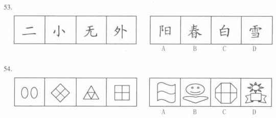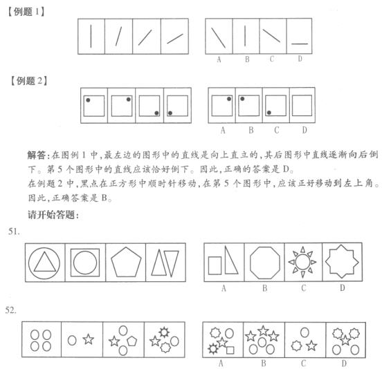 本部分包括四种类型的试题: 一、图形推理。共10题。包括三种类型的题目: 1.每道题目的左边4个图形呈现一定的规律性。你需要在右边所给出的备选答案中选出一个最合理的正确答案。每道题只有一个正确答案。 请看例题: