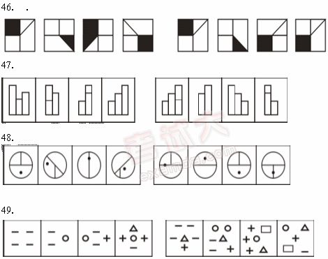 图形推理:共8 8题。包括两种类型的题目:每道题目的左右4 4个图形呈现一定的规律性,你需要在右边所给出的备选答案中选出一个最合合理的答案使之符合左边的规律性。每道题只有一个正确答案。