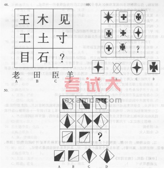 48.B 【解析】第一组每个字都是由四笔组成,第一组图都是由三笔组成,第三组图可知前两个字由五笔组成,观察选项只有B项符合。