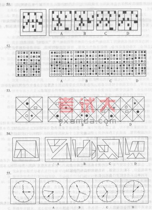 51.A 【解析】此题为6个长方型块组合而成,所以每一不块只有2种旋转形成,故由图可知,选A。