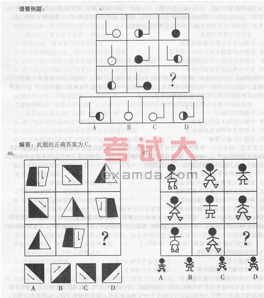 46.C 【解析】第一组每个图形经过翻转后,得到第二组,第二组图形再经过翻转,变为第三组,实际上,第三组图形与第一组图形一样,只是顺序不同。