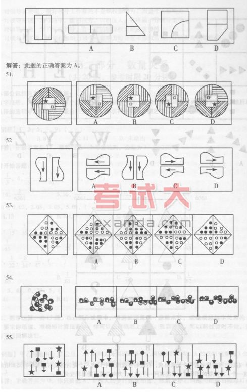55.D 【解析】这是一道排列题,移动线条,便变换成不同的图形,比较选项中的图形是否与给出图形相符。