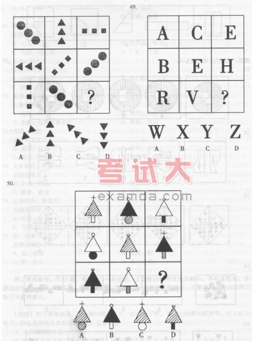 49.D 【解析】此题为字线找规律题,第三行为字母按顺序递加3,得答案D。