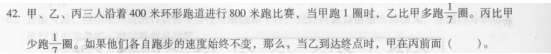 42.c 【解析】设单位为圈,即s=2,那么V甲=l=7/7,Vz.=1+1/7=8/7,V丙=l一1/7=6/7,当乙到终点时,St=2,那么所需的时间t=s乙/V乙=2÷8/7=7/4,那么s甲=1×7/4,s丙=6/7 x7/4=6/4,则s1/4圈,而一圈有400米,所以相差的距离是100米。