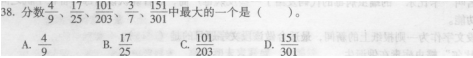 38?D 【解析】首先目测可以知道3,/7、17/35和101/203都小于1/2,而4/9和151/301都大于1/2,所以只要比较二者的大小就可以,通过计算,151/301大,所以选择D。
