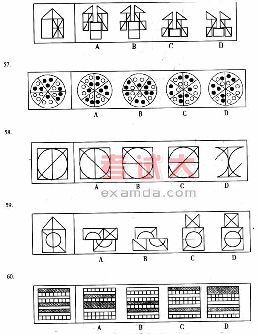 59.C 【解析】右边的图形是由左边的图形拆分后组合而成的。选项A错在新组合成的正方形上,多了一条对角线;选项B错在下面的含有半圆的部分中的斜线位置不对,应该在左边;选项c中下面部分是由左边图形中的下面部分旋转90度后得到的,上面部分是由左边图形中上面的两个三角形组成的;选项D错在上面的正方形多一条对角。故选C。
