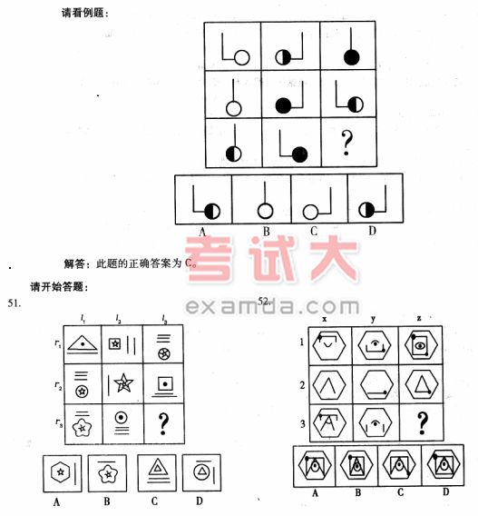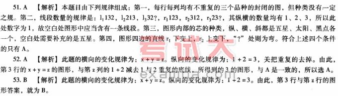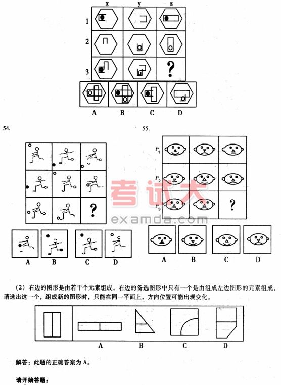 55.C 【解析】此题有三个规律:第一,耳朵与头连接的规律:r1开闭开,r2开形式工闭,r3闭开“?”每行均有两个“开”,故此处耳朵与头连接方式为开,且只有一边开;第二,眼睛颜色的变化规律:r1黑白黑,r2白黑黑,r3黑黑“?”每行均有两个黑眼睛,而此图中,横向的黑眼睛与纵向的黑眼睛均已经有了两个,故此处为白眼睛。第三,嘴变化的规律:1上下平,r2平上下,r3下平“?”纵横都缺少上嘴,故此处为上嘴,它也符合斜向统一都是上嘴的规律。鼻子没有变化规律,其形状、颜色的变化均有干扰因素。因此,符合上述三个条件的选项只有C。