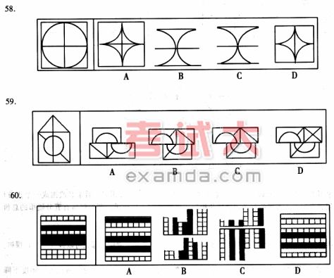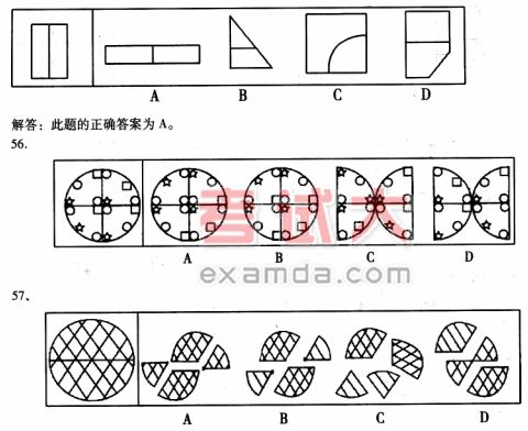 57.A 【解析】右边图形是由左边图形拆分后的各部分重新组合而成的。选项A中的扇形所组合成的大圆是由5条左上一右下方向的平行线和5条右上一左下方向的平行线分割;选项B、C错在其中的小扇形都只是一个方向的平行线分割,选项D中有一个大圆形也只是被一个方向的平行线分割;左边所给出的大圆都被5条左上一右下方向的平行线和5条右上一左下方向的平行线分割;所l:2iE确答案为A。