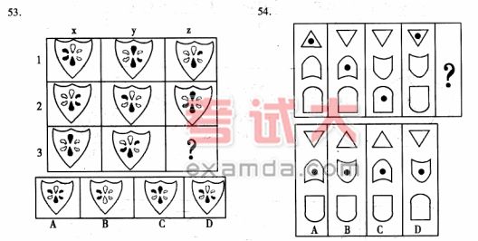 53.D 【解析】盾牌上的花纹为黑点的数量是:横向的x、y、z,纵向的1、2、3均为332,323,23“?”,空白项的黑点,纵横数量均应为3。由此就排除了A和B。进一步看,黑点的位置,除共同的都有下部的,纵向有1、2、3总和都是左右各2个,横向的x、y、z的总和也是左右各2个,因此选D。