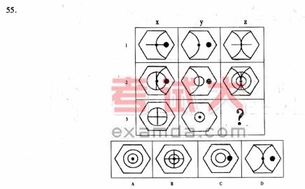 55.B 【解析】此题的解题方法是:横向为x、y、z,规律是x+y-(二者的重复部分)=z,纵向为1、2、3,规律是l+2-(二者的重复部分)=3,即可得到未知项为B。