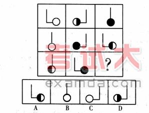 51.B 【解析】此题的规律是:第一,直角的旋转,横向均为逆时针旋转,纵向均为顺时针旋转。第二,圆点颜色的规律,第一纵列和横排黑白黑;第二纵列和横列白黑白;第三纵列和横排黑白“?”。纵向横向都要求为黑,对角线则均为黑,故此处为黑球。第三,横线顶部小三角形的方向规律:每纵向的列和横向的行,都有两个三角形的角连直线,一个三角形的边连直线,故应当选择角连直线的。符合上述三个规律的是B。
