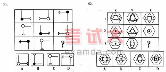 52.D 【解析】此题的解题方法与上面的题完全相同。即横向是x+y-(二者的重复部分)=z,纵向是l+2-(二者的重复部分)=3,即可得到未知项为D。
