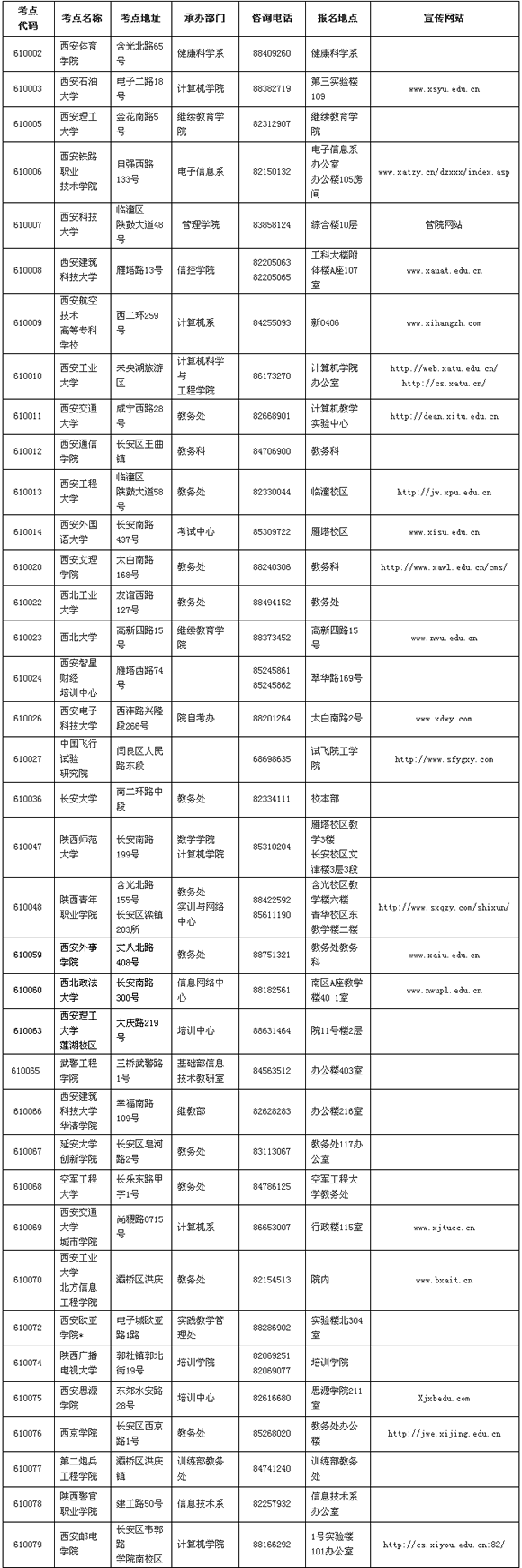 2011年西安市全国计算机等级考试考点一览表