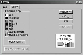 在菜单栏下的“格式”菜单中或在右键快捷菜单中选择“幻灯片配色方案”命令,弹出“配色方案”对话窗,在“自定义”选项卡中,双击“强调文字和超级链接”左侧的颜色块(如图),在“强调文字和超级链接颜色”对话框中选择适合的颜色;同样双击“强调文字和尾随超级链接”的颜色即可修改已访问超级链接的颜色。设置完毕后,单击“应用”就可以了。这时当你执行超级链接时就会变成所设置的颜色了,而且在不同的计算机上演示效果都是一样的。