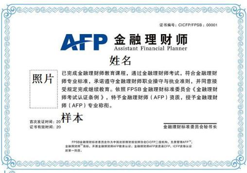 AFP金融理财师认证证书必须经考试取得,考试为全国统一考试,每年四次,分别为1月、4月、7月、11月第三个周末,通过的AFP金融理财师考试, CICFP金融理财标准委员会颁发《AFP金融理财师》资质证书。持证人可以在从事金融理财业务、宣传、名片中使用AFP商标和标识。