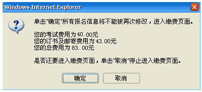 考生可自行选择考试所需教材,若需快递送书服务,则需填写送书地址和邮政编码(为方便快递送达请尽可能写单位地址),订书5本以下(含5本)快递费人民币6元,5本以上快递费人民币8元。每人限订一套教材。考生可登录相关网站免费试听课程,并根据需要自主选择网络辅导学习课程。确认上述信息无误后,按“缴费”按钮,提示如下信息:
