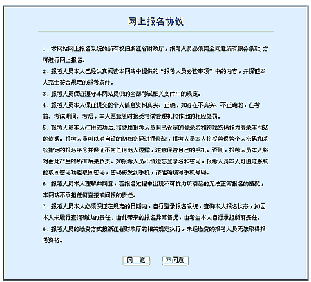 对于没有注册过的考生,应先注册。首先点击 “注册”按钮,显示报考人员网上报名承诺书页面,如下图所示: