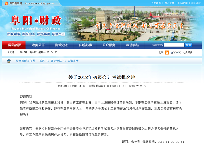 2018年安徽省阜阳市初级会计职称考试报名时间为2017年11月6日至11月30日,有很多阜阳户籍外出务工人员咨询能否回户籍地报考初级。针对此问题阜阳市财政局进行了回复。