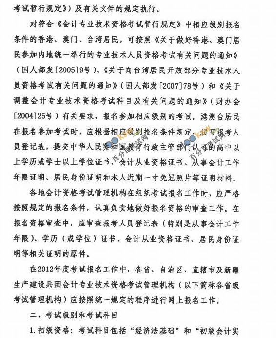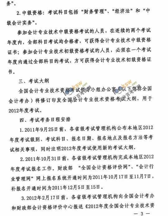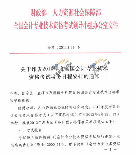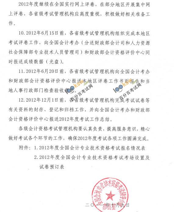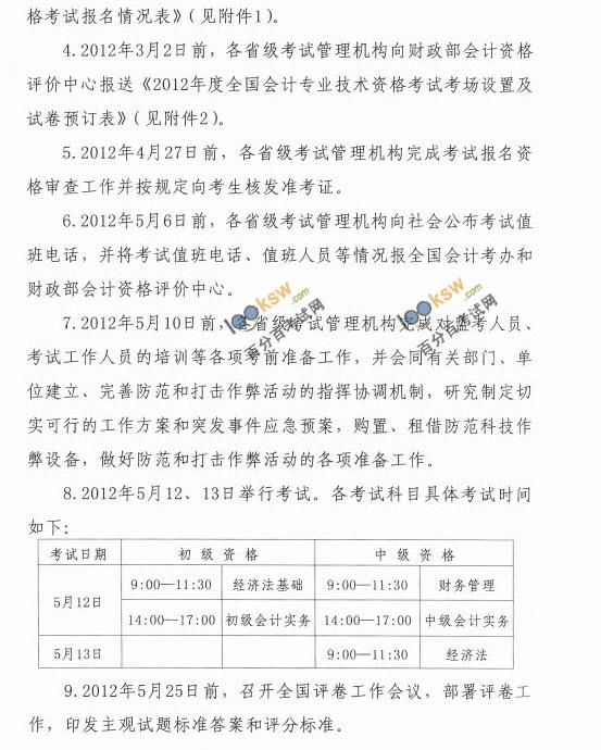关于2012年度全国会计专业技术资格考务日程安排通知