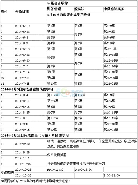 为帮助同学们顺利完成2014年中级会计师学习,我们制定了这份学习计划表,以方便同学们对今后5个月的学习进度进行全面控制,达到较好的学习效果。