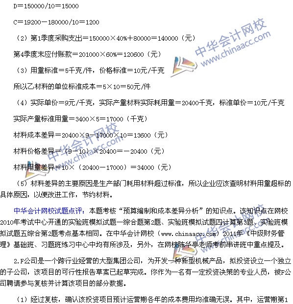 一、单项选择(本类题共25小题,每小题1分,共25分,每小题备选答案中,只有一个符合题意的正确答案。请将选定的答案,按答题卡要求,用2B铅笔填涂答案卡中题号1至25信息点。多选,错选,不选均不得分)。 1.下列各项中,属于商业信用筹资方式的是( )。 A.发行短期融资券 B.应付账款筹资 C.短期借款 D.融资租赁 参考答案:B 百分百考试网校答案解析:商业信用是指企业在商品或劳务交易中,以延期付款或预收货款方式进行购销活动而形成的借贷关系,是企业之间的直接信用行为,也是企业短期资金的重要来源。商业信用的形式包括:应付账款、应计未付款和预收货款,所以本题正确答案为B.参见教材174~176页。 百分百考试网校试题点评:本题考核“商业信用”这个知识点。该知识点与网校2011年考试中心开通的实验班模拟试题二单选第12题、普通班模拟试题五单选第15题考点基本相同。在2011年“梦想成真”系列辅导丛书之《应试指南。中级财务管理》119页例题17单选题、《经典题解。中级财务管理》118页随堂演练(五)第1题单选题基本一致。在百分百考试网校(www.chinaacc.com)2010年《中级财务管理》基础班、习题班练习中心中均有所涉及,另外,在网校陈华亭老师考前串讲班中重点提及。 2.某公司月成本考核例会上,各部门经理正在讨论、认定直接人工效率差异的责任部门。根据你的判断,该责任部门应是( )。 A.生产部门 B.销售部门 C.供应部门 D.管理部门 参考答案:A 百分百考试网校答案解析:直接人工效率差异是效率差异,其形成的原因是多方面的,工人技术状况、工作环境和设备条件的好坏等,都会影响直接人工效率的高低,但其主要责任还是在生产部门,所以本题正确答案为A.参见教材203页。 百分百考试网校试题点评:本题考核“直接人工差异形成的原因”这个知识点。该知识点与网校2011年考试中心开通的普通班模拟试题四单选第18题、普通班模拟试题五单选第24题考点基本相同。在2011年“梦想成真”系列辅导丛书之《应试指南。中级财务管理》142页例题13多选题、《经典题解。中级财务管理》156页单选题第22题基本一致。在百分百考试网校(www.chinaacc.com)2010年《中级财务管理》基础班、习题班练习中心中均有所涉及,另外,在网校陈华亭老师考前串讲班中重点提及。 3.某公司非常重试产品定价工作,公司负责人强调,产品定价一定要正确反映企业产品的真实价值消耗和转移,保证企业简单再生产的继续进行。在下列定价方法中,该公司不宜采用的是( )。 A.完全成本加成定价法 B.制造成本定价法 C.保本点定价法 D.目标利润定价法 参考答案:B 百分百考试网校答案解析:制造成本是指企业为生产产品或提供劳务等发生的直接费用支出,一般包括直接材料、直接人工和制造费用。由于它不包括各种期间费用,因此不能正确反映企业产品的真实价值消耗和转移。利用制造成本定价不利于企业简单再生产的继续进行,所以本题正确答案为B.参见教材188页。 百分百考试网校试题点评:本题考核“产品定价方法”的知识点。该知识点在网校2011年考试中心开通的实验班模拟试题五单选题第18题考点基本相同。在2011年“梦想成真”系列辅导丛书之《经典题解。中级财务管理》138页随堂演练(二)第2题单选题基本一致。在百分百考试网校(www.chinaacc.com)2011年《中级财务管理》基础班、习题班练习中心中均有所涉及,另外,在网校陈华亭老师考前串讲班中重点提及。 4.股利的支付可减少管理层可支配的自由现金流量,在一定程度上和抑制管理层的过度投资或在职消费行为。这种观点体现的股利理论是( )。 A.股利无关理论 B.信号传递理论 C."手中鸟"理论 D.代理理论 参考答案:D 百分百考试网校答案解析:代理理论认为股利政策有助于缓解管理者与股东之间的代理冲突。股利的支付能够有效地降低代理成本。首先,股利的支付减少了管理者对自由现金流量的支配权,这在一定程度上可以抑制公司管理者的过度投资或在职消费行为(所以选项D的说法正确),从而保护外部投资者的利益;其次,较多的现金股利发放,减少了内容融资,导致公司进入资本市场寻求外部融资,从而公司将接受资本市场上更多的、更严格的监督,这样便能通过资本市场的监督减少了代理成本。参见教材214页。 百分百考试网校试题点评:本题考核“股利分配政策”的知识点。该知识点在网校2011年考试中心开通的实验班模拟试题五单选题第24题、普通班模拟试题一判断题第8题考点基本相同。在2011年“梦想成真”系列辅导丛书之《应试指南。中级财务管理》158页单选题第22题考点基本一致。在百分百考试网校(www.chinaacc.com)2011年《中级财务管理》基础班、习题班练习中心中均有所涉及,另外,在网校陈华亭老师考前串讲班中重点提及。 5. 下列关于成本动因(又称成本驱动因素)的表述中,不正确的是( )。 A.成本动因可作为作业成本法中的成本分配的依据 B.成本动因可按作业活动耗费的资源进行度量 C.成本动因可分为资源动因和生产动因 D.成本动因可以导致成本的发生 参考答案:C 百分百考试网校答案解析:成本动因亦称成本驱动因素,是指导致成本发生的因素,所以选项D的说法正确;成本动因通常以作业活动耗费的资源来进行度量,所以选项B的说法正确;在作业成本法下,成本动因是成本分配的依据,所以选项A的说法正确