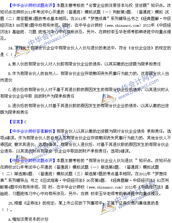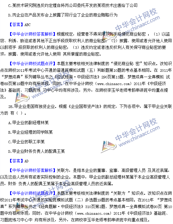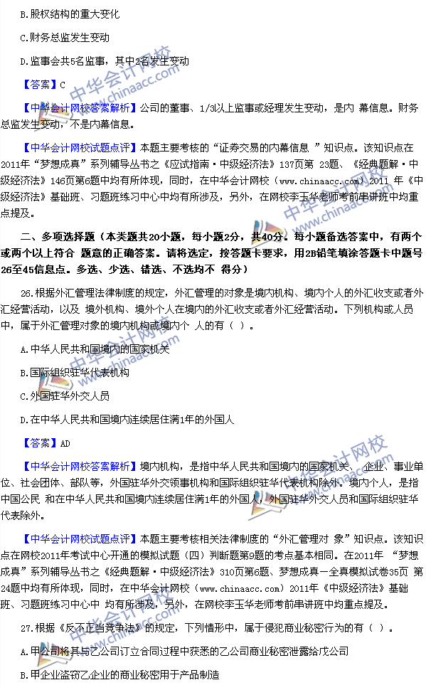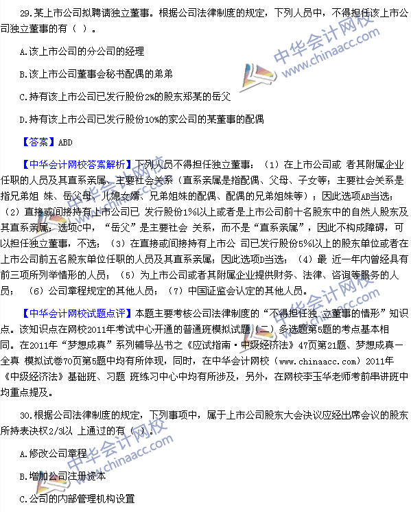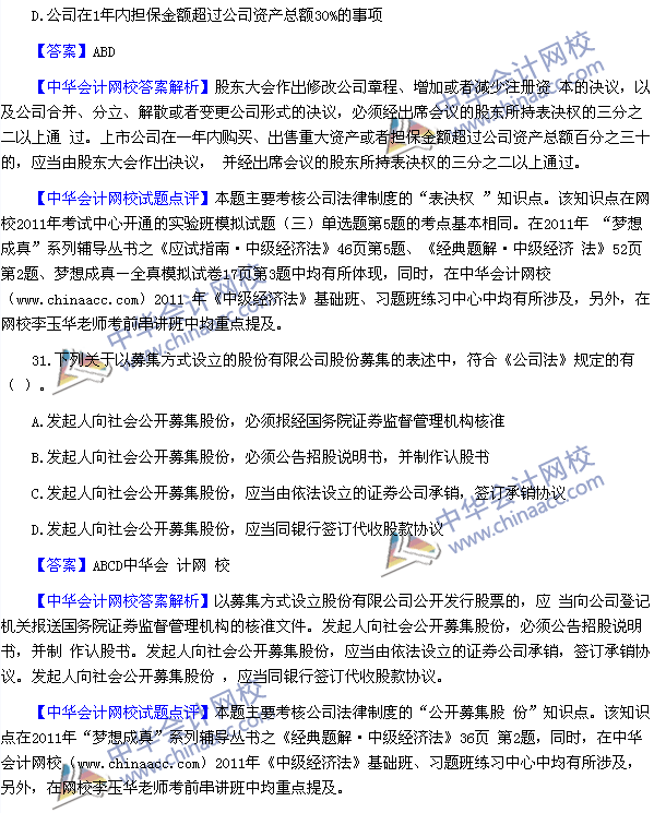 32.根据《个人独资企业法》的规定,下列各项中,可以用作个人独资企业名称的有( )。 A.云滇针织品有限公司 B.昆海化妆品经销公司 C.樱园服装设计中心 D.霞光婚纱摄影工作室 【答案】CD 【百分百考试网校答案解析】个人独资企业名称中不得使用“有限” 、“有限责任”或“公司”字样。个人独资企业的名称可以叫厂、店、部、中心、工作室等。 【百分百考试网校试题点评】本题主要考核其他主体法律制度的“个人独 资企业名称”知识点。该知识点在网校2011年考试中心开通的竞赛试题(四)单选题第7题的考点基本相同。在 2011年“梦想成真”系列辅导丛书之《应试指南·中级经济法》89页第3题有所体现,同时,在中华 会计网校(www.chinaacc.com)2011年《中级经济法》基础班、习题班练习中心中均有所涉及,另外,在网校李玉华老 师考前串讲班中均重点提及。 33.甲、乙、丙三人成立一特殊普通合伙制会计师事务所。甲在为一客户提供审计业务服务过程中,因重大过失 给客户造成损失200万元。下列关于对该损失承担责任的表述中,符合《合伙企业法》规定的有( )。 A.甲、乙、丙对此损失承担无限连带责任 B.甲对此损失承担无限责任 C.乙、丙对此损失不承担责任 D.乙、丙以其在会计师事务所中的财产份额为限承担责任 【答案】BD 【百分百考试网校答案解析】特殊的普通合伙企业中,一个合伙人或者数个合伙 人在执业活动中因故意或者重大过失造成合伙企业债务的,应当承担无限责任或者无限连带责任,其他合伙人以其在合 伙企业中的财产份额为限承担责任。 【百分百考试网校试题点评】本题主要考核其他主体法律制度的“特殊普 通合伙企业中合伙人的责任承担”知识点。该知识点在网校2011年考试中心开通的普通班模拟试题(一)判断题 第2题的考点基本相同。在2011年“梦想成真”系列辅导丛书之《应试指南·中级经济法》90页第7题 有所体现,同时,在百分百考试网校(www.chinaacc.com)2011年《中级经济法》基础班、习题班练习中心中均有所涉及 ,另外,在网校李玉华老师考前串讲班中均重点提及。 34.下列关于上市公司非公开发行股票的表述中,不符合证券法律制度规定的有( )。 A.某次发行的股份自发行结束之日,36个月内不得转让。 B.发行价格应不低于定价基准日前20个交易日公司股票的均价 C.募集资金须存放于公司董事会决定的专项账户 D.除金融类企业外,不得将募集资金直接或间接投资于以买卖证券为主要业务的公司 【答案】AB 【百分百考试网校答案解析】上市公司非公开发行股票,发行价格不低于定价基 准日前20个交易日公司股票均价的90%;因此选项A不符合规定。本次发行的股份自发行结束之日起,12个月内不得转让 ,控股股东、实际控制人及其控制的企业认购的股份,36个月内不得转让;因此选项B表述不符合规定。 【百分百考试网校试题点评】本题主要考核证券法律制度的“非公开发行 股票”知识点。该知识点在网校2011年考试中心开通的实验班模拟试题(一)题多选题17题的考点基本相同。在 2011年“梦想成真”系列辅导丛书之《应试指南·中级经济法》318页第12题、梦想成真-全真模拟 试卷5页第9题中均有所体现,同时,在百分百考试网校(www.chinaacc.com)2011年《中级经济法》基础班、习题班练习 中心中均有所涉及,另外,在网校李玉华老师考前串讲班中均重点提及。 35.根据《证券市场禁入规定》的规定,下列情形中,属于可以对有关责任人员从轻、减轻或免予采取证券市场 禁入措施的有( )。 A.有关责任人员主动消除违法行为后果的 B.有关责任人员主动减轻违法行为后果的 C.有关责任人员配合查处违法行为有立功表现的 D.有关责任人员受他人指使从事违法行为,且能主动交代违法行为的 【答案】ABCD 【百分百考试网校答案解析】根据《证券市场禁入规定》,有下列情形之一的, 可以对有关责任人员从轻、减轻或者免予采取证券市场禁入措施:(1) 主动消除或者减轻违法行为危害后果的;(2 ) 配合查处违法行为有立功表现的;(3) 受他人指使、胁迫有违法行为,且能主动交待违法行为的;(4) 其他可 以从轻、减轻或者免予采取证券市场禁入措施的。 【百分百考试网校试题点评】本题主要考核证券法律制度的“证券市场禁 入责任”知识点。该知识点在网校2011年考试中心开通的竞赛试题(三)判断题第6题的考点相似。在2011年 “梦想成真”系列辅导丛书之《应试指南·中级经济法》138页第23题有所体现,同时,在中华会计 网校(www.chinaacc.com)2011年《中级经济法》基础班、习题班练习中心中均有所涉及,另外,在网校李玉华老师考 前串讲班中均重点提及。 36.根据上市公司收购法律制度的规定,下列情形中,属于表明投资者获得或拥有上市公司控制权的有( )。 A.投资者为上市公司持股50%以上的控股股东 B.投资者可实际支配上市公司股份表决权超过30% C.投资者通过实际支配上市公司股份表决权能够决定公司董事会1/3成员选任 D.投资者依其可实际支配的上市公司股份表决权足以对公司股东大会的决议产生重大影响 【答案】ABD 【百分百考试网校答案解析】根据《上市公司收购管理办法》规定,有下列情形 之一的,为拥有上市公司控制权:(1)投资者为上市公司持股50%以上的控股股东;(2)投资者可以实际支配上市公 司股份表决权超过30%;(3)投资者通过实际
