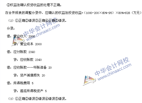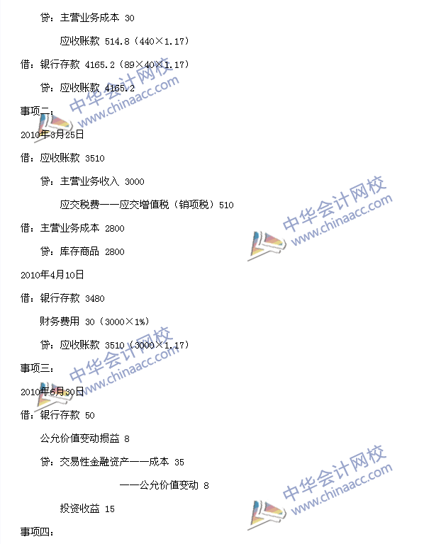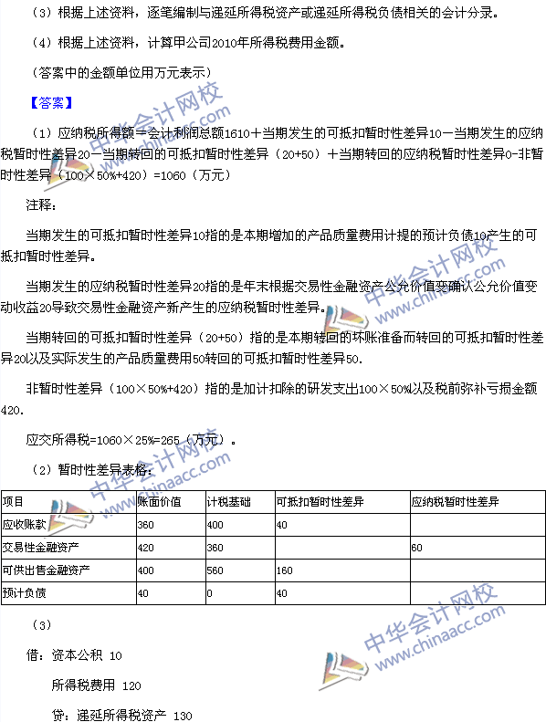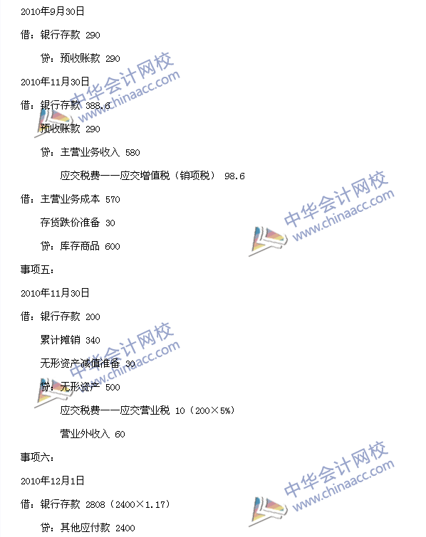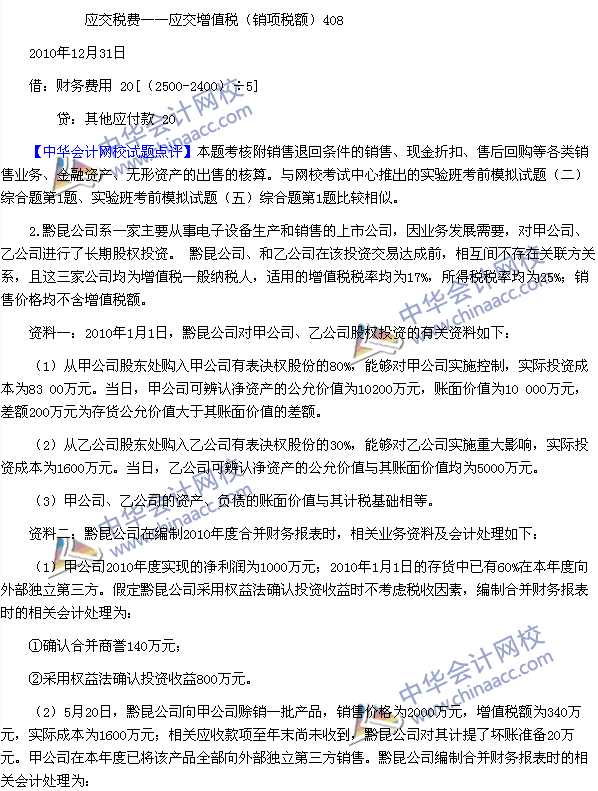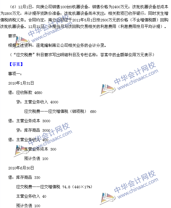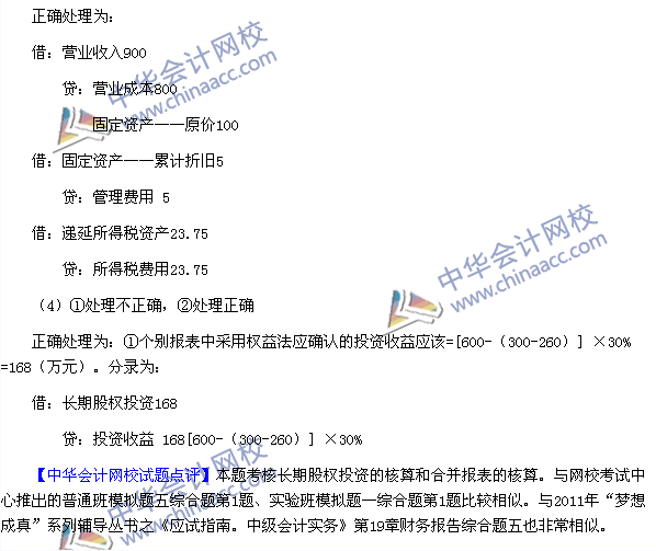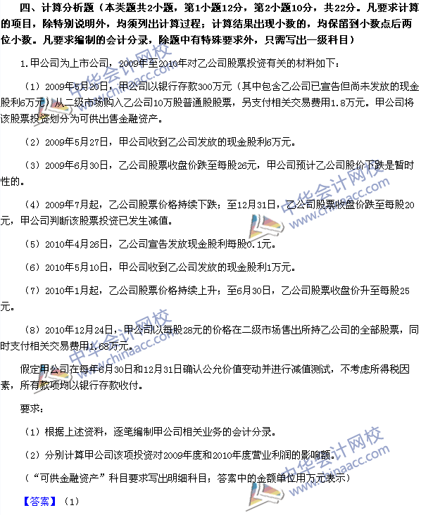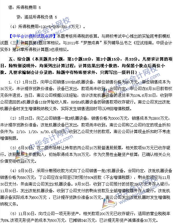 一、单项选择题(本类题共15小题,每小题1分,共15分。每小题备选答案中,只有一个符合题意的正确答案。请将选定的答案,按答题卡要求,用2B铅笔填涂答题卡中题号1至15信息点,多选、错选,不选均不得分。) 1.下列各项外币资产发生的汇兑差额,不应计入当期损益的是( )。 A.应收账款 B.交易性金融资产 C.持有至到期投资 D.可供出售权益工具投资 【答案】D 【百分百考试网校答案解析】选项A,计入财务费用,选项B,计入公允价值变动损益,选项C,计入财务费用,选项D,计入资本公积。 【百分百考试网校试题点评】本题考核“汇兑差额”知识点,该知识点与网校2011年考试中心竞赛试题二多选第10题、2011年习题班练习中心第16章判断第1题考点基本相同。 2.下列关于会计估计及其变更的表述中,正确的是( )。 A.会计估计应以最近可利用的信息或资料为基础 B.对结果不确定的交易或事项进行会计估计会削弱会计信息的可靠性 C.会计估计变更应根据不同情况采用追溯重述或追溯调整法进行处理 D.某项变更难以区分为会计政策变更和会计估计变更的,应作为会计政策变更处理 【答案】A 【百分百考试网校答案解析】选项B,会计估计变更不会削弱会计信息的可靠性;选项C,会计估计变更应采用未来适用法;选项D,应该作为会计估计变更处理。 【百分百考试网校试题点评】本题考核“会计估计变更”知识点。该知识点与网校2011年考试中心开通的实验班模拟试题三判断题8题,普通班模拟试题二判断8题,普通班模拟试题三多选8题、2011年基础班练习中心第17章多选第2题考点基本相同。 3.2010年12月31日,甲公司对一起未决诉讼确认的预计负债为800万元。2011年3月6日,法院对该起诉讼判决,甲公司应赔偿乙公司600万元;甲公司和乙公司均不再上诉。甲公司的所得税税率为25%,按净利润的10%提取法定盈余公积,2010年度财务报告批准报出日为2011年3月31日,预计未来期间能够取得足够的应纳税所得额用以抵扣可抵扣暂时性差异。不考虑其他因素,该事项导致甲公司2010年12月31日资产负债表“未分配利润”项目“期末余额”调整增加的金额为( )万元。 A.135 B.150 C.180 D.200 【答案】A 【百分百考试网校答案解析】账务处理如下: 借:预计负债 800 贷:以前年度损益调整 200 其他应付款600 借:以前年度损益调整——调整所得税费用200 贷:递延所得税资产200 借:应交税费——应交所得税150 贷:以前年度损益调整 ——调整所得税费用150 借:以前年度损益调整 150 贷:盈余公积 15 利润分配——未分配利润 135 【百分百考试网校试题点评】本题考核“日后未决诉讼结案”知识点,该知识点与网校2011年全真模拟试卷五综合题2题,应试指南284页计算分析题第1题、2011年习题班练习中心第8章单选题第7题考点基本相同。 百分百考试网校 4.2011年4月1日,甲事业单位采用融资租赁方式租入一台管理用设备并投入使用。租赁合同规定,该设备租赁期为5年,每年4月1日支付年租金100万元,租赁期满后甲事业单位可按1万元的优惠价格购买该设备。当日,甲事业单位支付了首期租金。甲事业单位融资租入该设备的入账价值为( )万元。 A.100 B.101 C.500 D.501 【答案】D 【百分百考试网校答案解析】账务处理如下: 借:固定资产 501 贷:其他应付款 501 【百分百考试网校试题点评】本题考核“事业单位融资租入固定资产入账价值”知识点,该知识点与网校2011全真模拟试卷四单选15题,经典题解317页第2题考点基本相同。 5.投资性房地产的后续计量从成本模式转为公允价值模式的,转换日投资性房地产的公允价值高于其账面价值的差额会对下列财务报表项目产生影响的是( )。 A.资本公积 B.营业外收入 C.未分配利润 D.投资收益 【答案】C 【百分百考试网校答案解析】投资性房地产由成本模式转为公允价值模式,应该作为会计政策变更处理,公允价值与价值的差额应计入留存收益。所以选择C选项。 【百分百考试网校试题点评】本题考核“投资性房地产核算模式转换”知识点。该知识点与网校2011年考试中心开通的实验班模拟试题二判断题6题,实验班模拟试题五多选8题、2011年基础班练习中心第4章单选第11题考点基本相同。 6.2010年12月31日,甲公司建造了一座核电站达到预定可使用状态并投入使用,累计发生的资本化支出为210 000万元。当日,甲公司预计该核电站在使用寿命届满时为恢复环境发生弃置费用10 000万元,其现值为8 200万元。该核电站的入账价值为( )万元。 A.200 000 B.210 000 C.218 200 D.220 000 【答案】C 【百分百考试网校答案解析】分录为: 借:固定资产 218200 贷:在建工程 210000 预计负债 8200 【百分百考试网校试题点评】本题考核“存在弃置费用的固定资产入账价值”知识点。该知识点与网校2011年考试中心开通的实验班模拟试题一判断题2题考点基本相同。 7.下列各项中,影响长期股权投资账面价值增减变动的是( )。 A.采用权益法核算的长期股权投资,持有期间被投资单位宣告分派股票股利 B.采用权益法核算的长期股权投资,持有期间被投资单位宣告分派现金股利 C.采用成本法核算的长期股权投资,持有期间被投资单位宣告分派股票股利 D.采用成本法核算的长期股权投资,持有期间被投资单位宣告分派现金股利 【答案】B 【百分百考试网校答案解析】选项B的分录为: 借:应收股利 贷:长期股权投资 【百分百考试网校试题点评】本