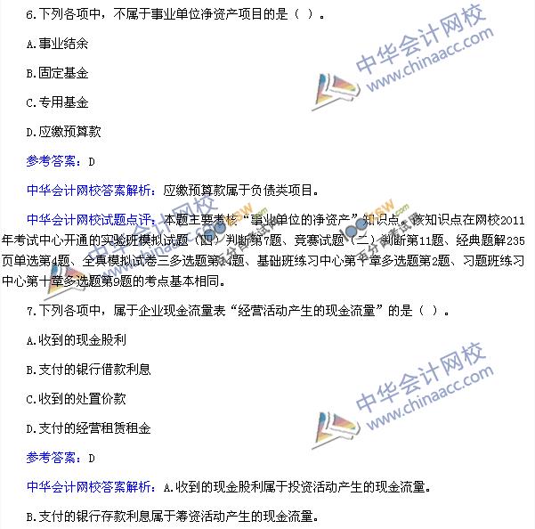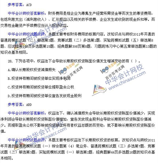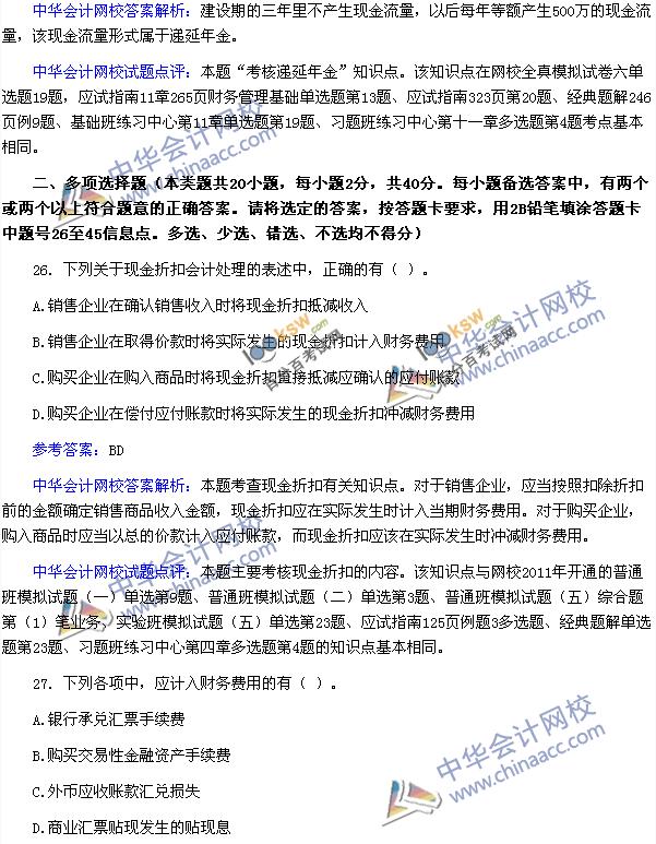 29.下列各项中,会引起负债和所有者权益同时发生变动的有( )。 A.以盈余公积补亏 B.以现金回购本公司股票 C.宣告发放现金股利 D.转销确实无法支付的应付账款 参考答案:CD 百分百考试网校答案解析:盈余公积补亏属于所有者权益科目内部的变动;现金回购本公司股票是资产的减少同时所有者权益减少;宣告发放现金股利是负债的增加同时所有者权益的减少;转销无法支付的应付账款是负债的减少同时所有者权益的增加。 百分百考试网校试题点评:本题主要考核引起负债和所有者权益同时发生变动的事项。该知识点与网校2011年开通的竞赛试题(二)单选第14题、实验班模拟试题(五)多选第6题、经典题解308页单选题第6题的知识点基本相同。 30.下列各项中,影响当期营业利润的有( )。 A.所得税费用 B.固定资产减值损失 C.销售商品收入 D.投资性房地产公允价值变动收益 参考答案:BCD 百分百考试网校答案解析:所得税费用在利润总额之后列示,不会影响营业利润;固定资产减值损失计入当期资产减值损失;销售商品收入计入营业收入;投资性房地产公允价值变动收益计入当期公允价值变动损益。 百分百考试网校试题点评:本题主要考核影响营业利润的内容。该知识点与网校2011年开通的普通班模拟试题(一)单选第5题、普通班模拟试题(二)多选第5题、普通班模拟试题(三)多选第14题、普通班模拟试题(五)单选第6题、应试指南311页第18题、经典题解141页例1题、全真模拟试卷85页第17题、基础班练习中心第六章单选题第1题、习题班练习中心第六章单选题第1题中均有所体现。 31.下列各项中,应列入资产负债表“应收账款”项目的有( )。 A.预付职工差旅费 B.代购货单位垫付的运杂费 C.销售产品应收取的款项 D.对外提供劳务应收取的款项 参考答案:BCD 百分百考试网校答案解析:应收账款是指企业因销售商品、提供劳务等经营活动,应向购货单位或接受劳务单位收取的款项,主要包括企业销售商品或提供劳务等应向有关债务人收取的价款及代购货单位垫付的包装费、运杂费等。 百分百考试网校试题点评:本题主要考核应收账款的核算内容。该知识点与网校2011年开通的普通班模拟试题(三)单多选第1题、应试指南11页例9题、《经典题解39页第5题、全真模拟试卷68页第6题、基础班练习中心多选题第22题的知识点基本相同。 32.下列各项中,应列入资产负债表“应付利息”项目的有( )。 A.计提的短期借款利息 B.计提的一次还本付息债券利息 C.计提的分期付息到期还本债券利息 D.计提的分期付息到期还本长期借款利息 参考答案:ACD 百分百考试网校答案解析:短期借款计提的利息、分期付息到期还本的长期借款及应付债券的计提的利息应当计入应付利息科目;计提的一次还本付息债券利息应当计入应付债券——应计利息科目。 百分百考试网校试题点评:本题主要考核应付利息核算的内容。该知识点与网校2011年开通的实验班模拟试题(二)单选第23题、全真模拟试卷1页第4题、基础班练习中心第二章单选题第3题的知识点基本相同。 33.下列各项中,属于工业企业现金流量表“筹资活动产生的现金流量”的有( )。 A.吸收投资收到的现金 B.分配利润支付的现金 C.取得借款收到的现金 D.投资收到的现金股利 参考答案:ABC 百分百考试网校答案解析:筹资活动产生的现金流量主要包括:吸收投资收到的现金,取得借款收到的现金,偿还债务支付的现金,分配股利、利润和偿付利息支付的现金等。 百分百考试网校试题点评:本题主要考核筹资活动产生的现金流量的内容。实验班模拟试题(三)多选第6题、普通班模拟试题(二)多选7题、竞赛试题(三)多选第3题、应试指南189页多选题第15题、经典题解297页单选第24题、基础班练习中心第七章单选题第23题、习题班练习中心第七章单选题第6题的知识点基本相同。 34.下列各项中,应计提固定资产折旧的有( )。 A.经营租入的设备 B.融资租入的办公楼 C.已投入使用但未办理竣工决算的厂房 D.已达到预定可使用状态但未投产的生产线 参考答案:BCD 百分百考试网校答案解析:企业应当对所有的固定资产计提折旧,但是已经提足折旧的仍然继续使用的固定资产和单独计价入账的土地除外。企业对经营租入的设备不具有所有权,因此不对其计提折旧。 百分百考试网校试题点评:本题主要考核固定资产折旧的内容。该知识点与网校2011年开通的实验班模拟试题(四)判断第5题、应试指南45页第62题、经典题解33页第7题基础班练习中心第一章单选题第19题的知识点基本相同。 35.下列各项中,应作为职工薪酬计入相关资产成本的有( )。 A.设备采购人员差旅费 B.公司总部管理人员的工资 C.生产职工的伙食补贴 D.材料入库前挑选整理人员的工资 参考答案:CD 百分百考试网校答案解析:差旅费、总部管理人员工资应当计入管理费用;生产职工的伙食补贴应当计入生产成本;材料入库前挑选整理人员的费用应计入材料成本。 百分百考试网校试题点评:本题主要考核计入产品成本的应付职工薪酬。该知识点与网校2011年开通的实验班模拟试题(三)多选第10题、普通班模拟试题(一)多选15题、竞赛试题(四)多选13题、应试指南52页第56题、经典题解82页第10题的知识点基本相同。 36.下列关于成本计算平行结转分步法的表述中,正确的有( )。 A.不必逐步结转半成品成本 B.各步骤可