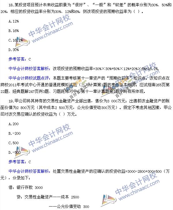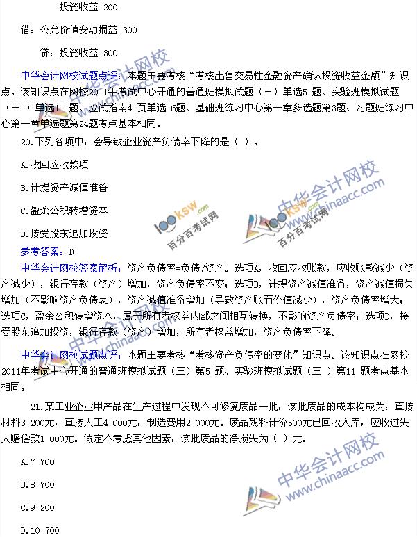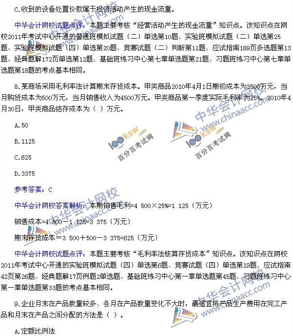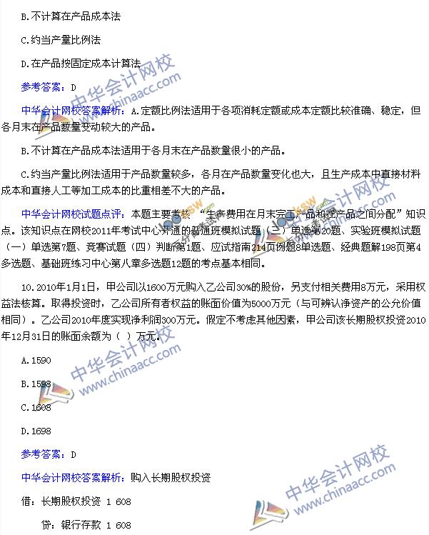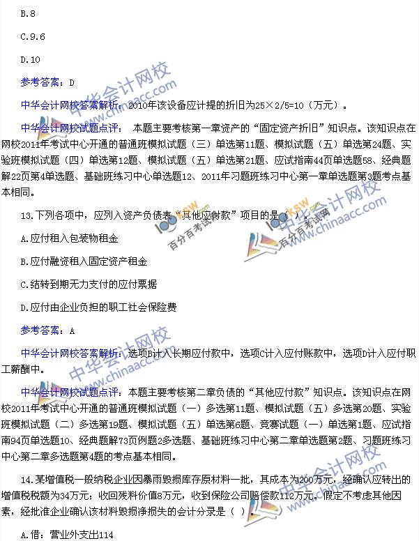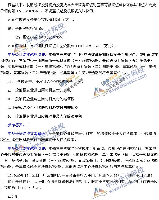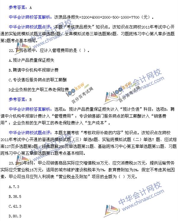 一、单项选择题(本类题共25小题,每小题1分,共25分。每小题备选答案中,只有一个符合题意的正确答案。请将选定的答案,按答题卡要求,用2B铅笔填涂答题卡中题号1至25信息点。多选、错选、不选均不得分) 1.下列各项中,应计入产品成本的是( )。 A.固定资产报废净损失 B.支付的矿产资源补偿费 C.预计产品质量保证损失 D.基本生产车间设备计提的折旧费 参考答案:D 百分百考试网校答案解析:A.固定资产报废净损失计入营业外支出。 B.支付的矿产资源补偿费计入管理费用。 C.预计产品质量保证损失计入销售费用。 百分百考试网校试题点评:本题主要考核“产品成本”知识点。该知识点在网校2011年考试中心开通的普通班模拟试题(一)单选第8题、普通班模拟试题(二)多选第13题、实验班模拟试题(三)多选第19题、竞赛试题(四)多选第19题、经典题解45页判断题第17题的考点基本相同。 2.2010年1月1日,甲公司采用分期付款方式购入大型设备一套,当日投入使用。合同约定的价款为2 700万元,分3年等额支付;该分期支付购买价款的现值为2 430万元。假定不考虑其他因素,甲公司该设备的入账价值为( )万元。 A.810 B.2 430 C.900 D.2 700 参考答案:B 百分百考试网校答案解析:如采用分期付款方式购买资产,且在合同中规定的付款期限比较长,超过了正常信用条件。在这种情况下,该类购货合同实质上具有融资租赁性质,购入资产的成本不能以各期付款额之和确定,而应以各期付款额的现值之和确定。 |
