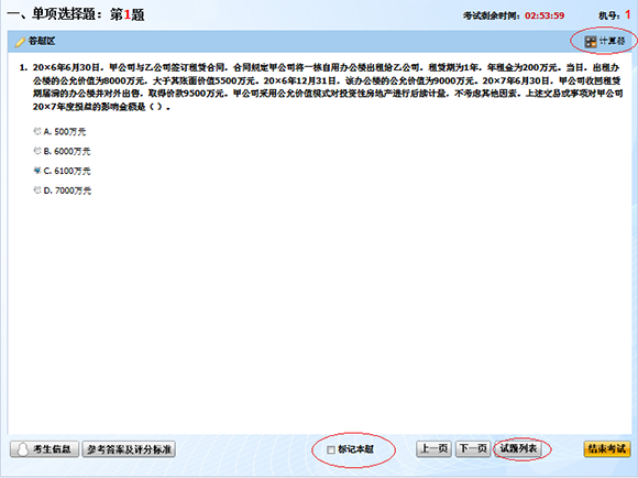 客观题也会有大量计算,有三种计算器供考生们选择,分别是:机考系统中的计算器(下图右上角)、Windows系统可调用的计算器、自行携带的计算器。其中机考系统中的计算器功能最为简单,只能进行简单的四则运算,但应付考试中的计算题已足够;Windows系统可调用的计算器功能最为强大;如果习惯手打,用自己携带的计算器也可以。无论选用哪一种计算器,最好在练习之初就确定下来,以方便今后常联系,熟能生巧。