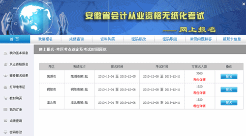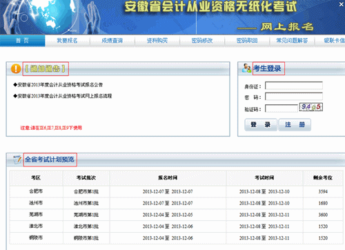 通过安徽省会计网提供的链接进入网上报名服务大厅首页。首页左上部是关于会计考试的通知公告,右上部是登录和注册功能,首页下方是全省考试计划预览,考生可以查询所有考区公布的考试计划的报名时间,考试时间,剩余考位等信息,如下图所示: