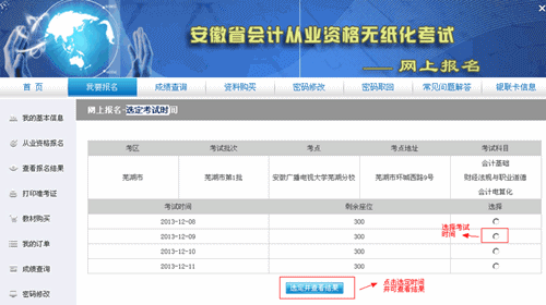 缴费成功后在原报名页面的弹出框点击缴费成功按钮,会自动跳转到选定考试日期页面,考生可以选择考试时间并查看结果。如图所示: