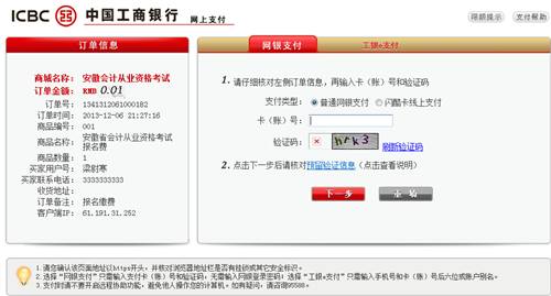 点击确认支付按钮后会弹出工行缴费平台页面,考生就可以进行网上缴费了,如下图: