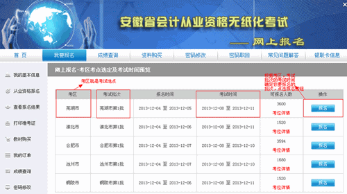 注册完成或直接登录就会进入正式报名流程,第一步是选择考试批次,考生可以通过考区和考试时间来选择考试批次,确定要报名的考试批次后,在这个批次中,点击报名按钮,即可报名这个考试批次了。如图所示: