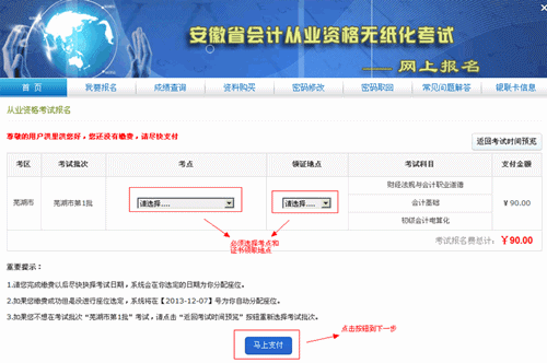 选择好考试批次点击报名后跳转到缴费支付页面,考生须选择考点和领取资格证书地点,然后点击马上支付按钮到下一步,如图所示: