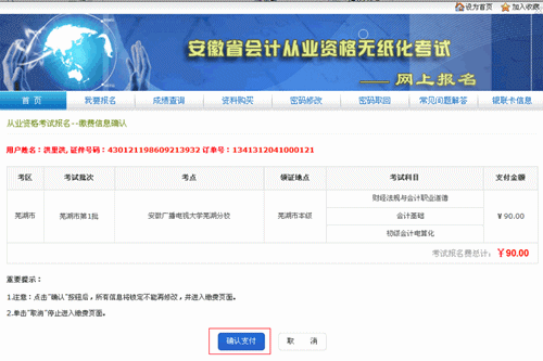 选择考点和领证地点后,跳转到确认支付页面,请考生确认自己的报名信息无误后,点击确认支付按钮,如下图: