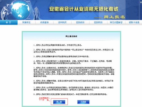 点击注册按钮后跳转到网上报名协议页面,请考生详细阅读报名协议,如同意协议点击同意按钮到下一步,如下图: