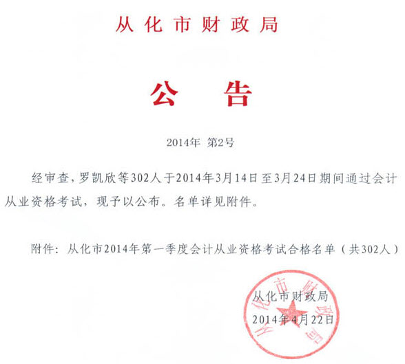 从化市2014年第一季度会计从业资格考试合格名单