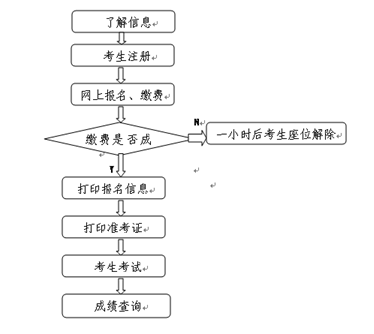 在报名期间登录系统后,通过《考生报名》模块进行报名,流程为:阅读考生须知→选择考试科目、考点、日期→网上缴费,必须在一小时内完成缴费,否则考生选择的考点和考试日期信息将与考生解除绑定,考生需重新选择考点和考试日期进行报名缴费。