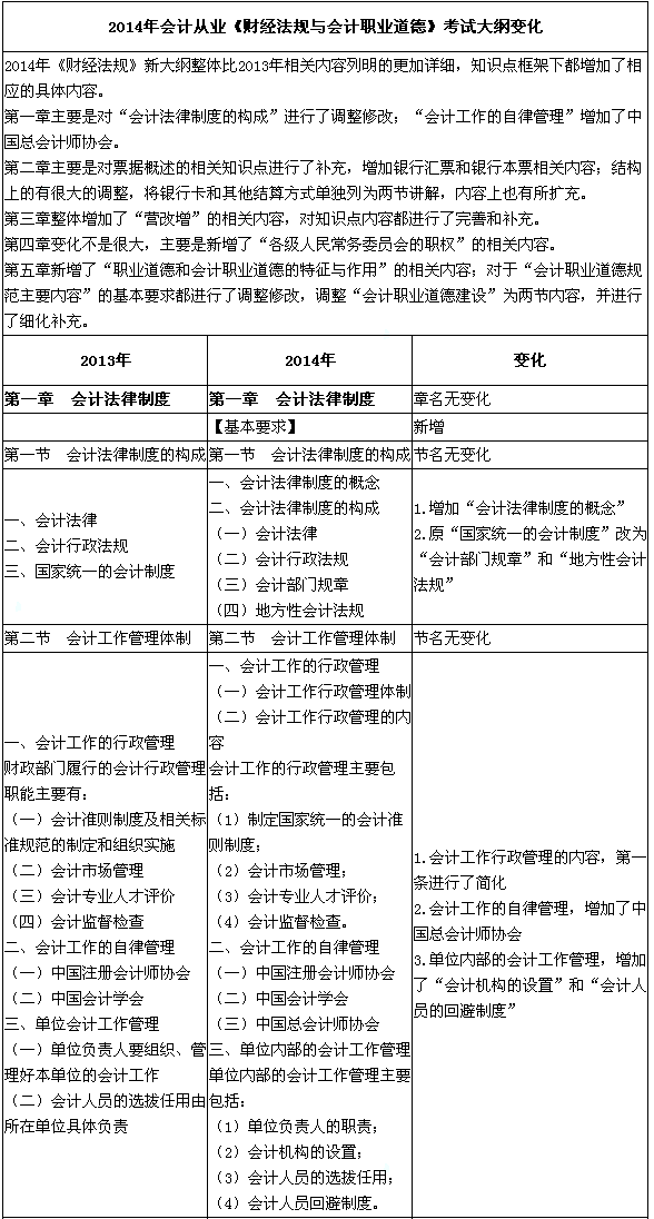 2014年会计从业资格考试新旧考试大纲对比——《财经法规与会计职业道德》