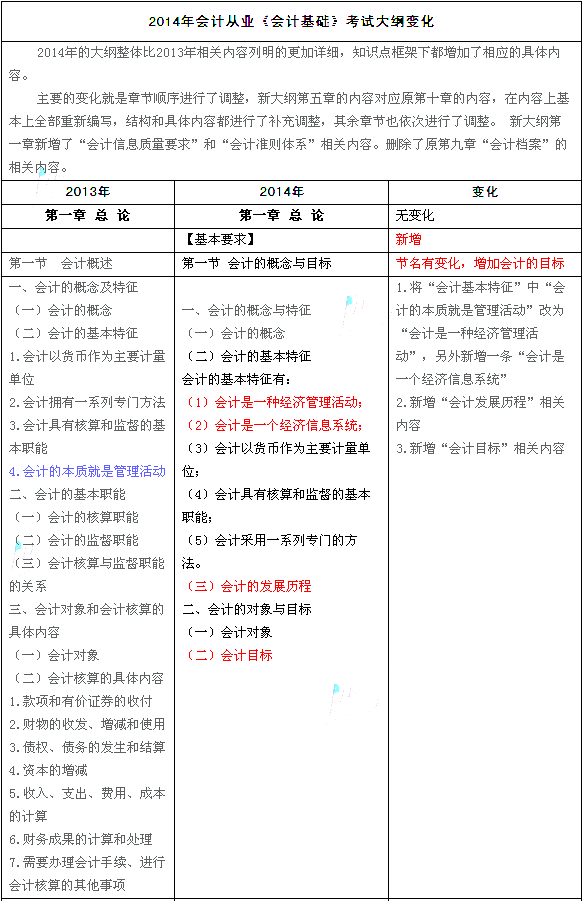 2014年《会计基础》新大纲整体比2013年相关内容列明的更加详细,知识点框架下都增加了相应的具体内容。