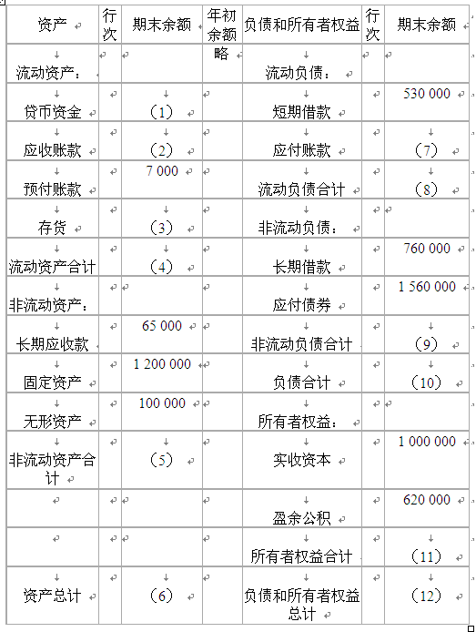 | 正确答案: (1) 编制的会计分录如下: ①借:应付账款 30 000 贷:银行存款 30 000 ②借:固定资产 210 000 贷:应付账款 210 000 ③借:库存商品 200 000 贷:生产成本 200 000 ④借:银行存款 300 000 贷:应收账款 300 000 (2) 填列后的资产负债表如下: ![]() |