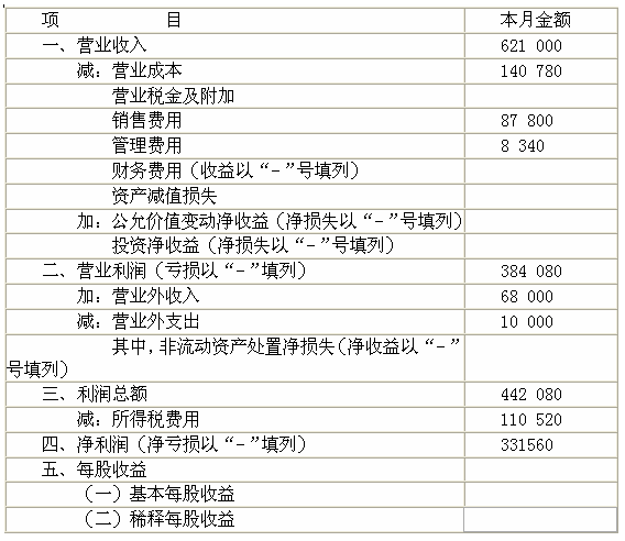 | 正确答案: (1) 借:库存现金 30 000 会计从业考试 贷:银行存款 30 0000 (2) 借:营业外支出 10 000 贷:银行存款 10 000 (3) 借:银行存款 200 000 贷:应收账款 200 000 (4) 借:固定资产 50 000 贷:银行存款 50 000 (5) 借:其他应收款 5 600 贷:库存现金 5 600 (6) 借:原材料 80 200 贷:应付账款 80 000 应付职工薪酬 200 (解析:入库后的挑选整理费200元,为员工劳务支出,所以计入“应付职工薪酬”。) (7) 借:银行存款 68 000 贷:营业外收入 68 000 (8) 借:应交税费—应交所得税 7 000 贷:银行存款 7 000 (9) 借:销售费用 60 000 贷:库存现金 60 000 (10) 借:制造费用 4 200 库存现金 1 400 贷:其他应收款 5 600 (解析:车间管理人员差旅费应计入制造费用) (11) 借:应收账款 1 000 贷:其他业务收入 1 000 (12) 借:管理费用 300 贷:现金 300 (13) 借:应收票据 620 000 贷:主营业务收入 620 000 (14) 借:生产成本 300 000 制造费用 10 000 销售费用 5 000 管理费用 1 200 贷:原材料 316 200 (15) 借:生产成本 32 000 制度费用 18 000 销售费用 20 000 管理费用 6 000 贷:应付职工薪酬 76 000 (16 借:生产成本 4 480 制度费用 2 520 销售费用 2 800 管理费用 840 贷:应付职工薪酬 10 640 (17) 借:生产成本 34 720(4 200+10 000+18 000+2 520) 贷:制造费用 34 720(4 200+10 000+18 000+2 520) (18) 借:库存商品 371 200(300 000+32 000+4 480+34 720) 贷:生产成本 371 200(300 000+32 000+4 480+34 720) (19) 借:主营业务成本 140 330 贷:库存商品 140 330 (20) 借:其他业务成本 450 贷:原材料 450 (21) 借:主营业务收入 620 000 其他业务收入 1 000 营业外收入 68 000 贷:本年利润 689 000 (22) 借:本年利润 246 920 贷:主营业务成本 140 330 其他业务成本 450 管理费用 8 340 销售费用 87 800 营业外支出 10 000 (23) 借:所得税费用 110 520 贷:应交税费—应交所得税 110 520 (24) 借:本年利润 110 520 贷:所得税费用 110 520 2.利润表 2009年6月 ![]() |
