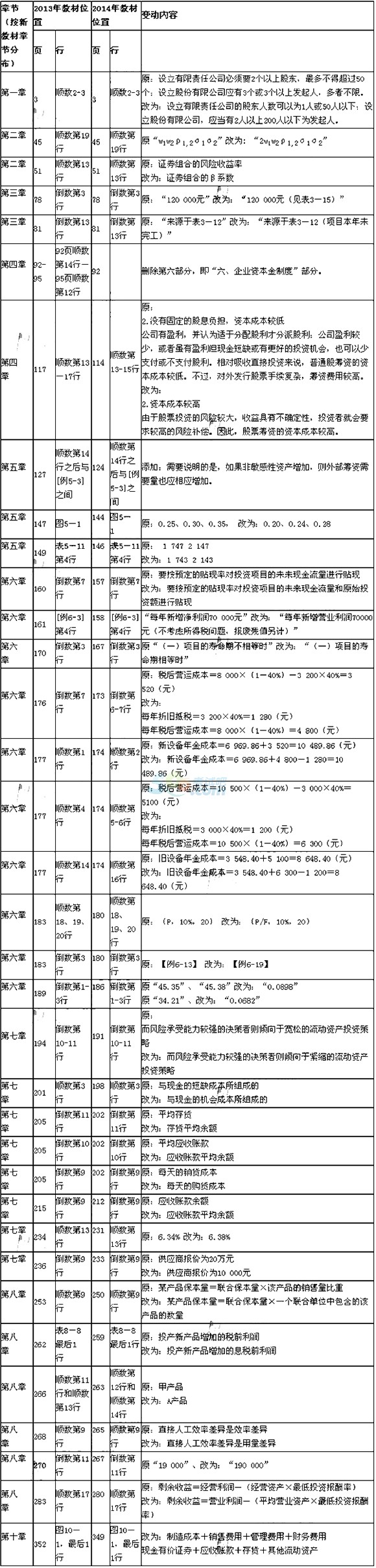 整体来看,较2013年教材相比,变化不大。主要是第一章有限责任公司和股份公司设立时对股东人数的要求发生变化;第四章删除了企业资本金制度的知识点;第四章发行普通股股票的筹资特点发生变化;第八章剩余收益的计算公式进行了调整。其他基本上都是对2013年教材的不妥之处进行的修正。具体参见下表。