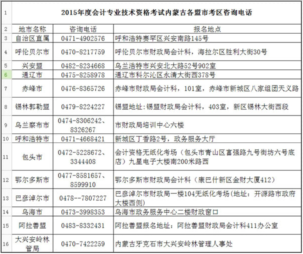 内蒙古各考区2015年中级会计职称考试咨询电话